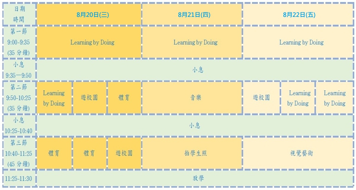 小一銜接課程富趣味的體驗活動,如音樂、體育及視藝科的活動式課堂。為照顧小一新生的身心需要,另教授小一新生學習自理、認識自己、營造班本氛圍、認識學校的環境及人物等,以建立孩子的安全感,適應新的學習環境。
